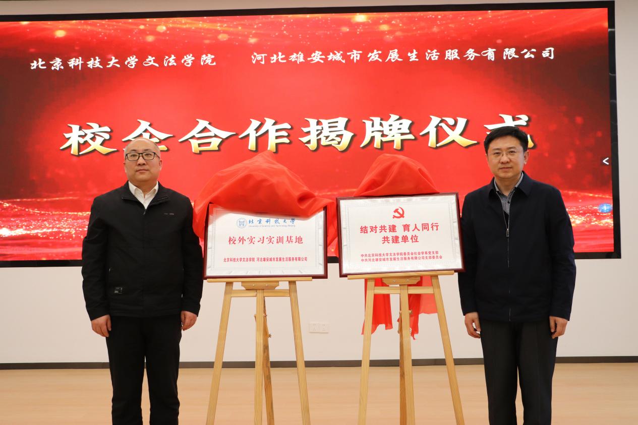 之后,双方就中共河北雄安城市发展生活服务有限公司支部委员会与皇冠博彩app 社会学系党支部进行党建共建、学生实习就业、科研课题研究等领域的合作进行了充分交流,共同签署了《校企合作备忘录》,举行了“结对共建、育人同行”、“校外实训基地”揭牌活动。