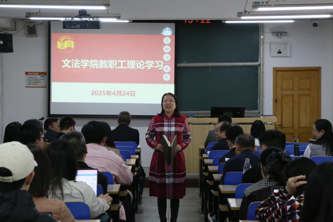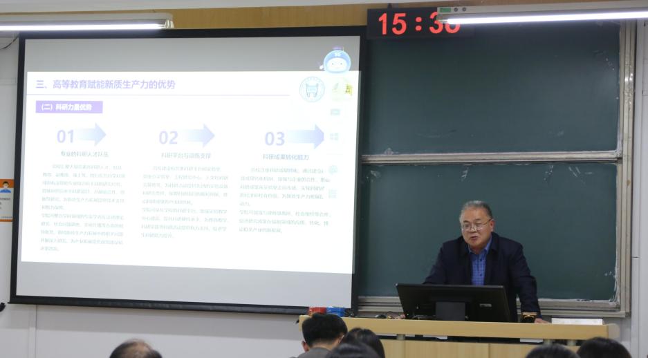 在文法楼301会议室举行教职工理论学习暨“领导干部上讲台”第二期活动。本次学习主要围绕“新质生产力驱动高质量发展”“本科教育教学数字化改革”“社科项目申报策略”三大主题展开。会议由皇冠博彩app