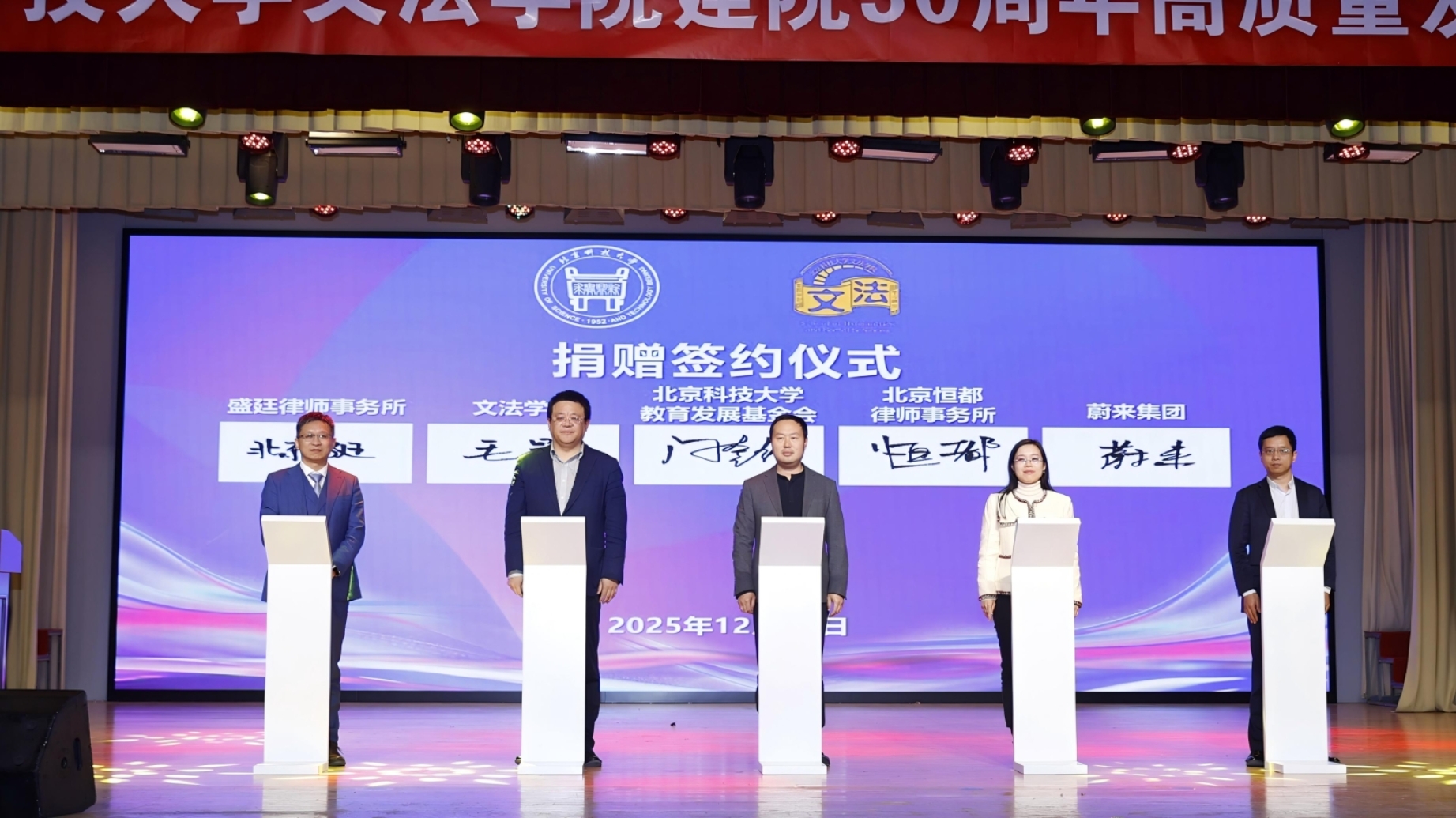 北京恒都律师事务所、盛廷律师事务所、蔚来法律创新研究院代表与学校校友会办公室、基金会办公室主任闫奎铭、皇冠博彩app 院长毛昊共同上台,启动捐赠合作仪式,携手为皇冠博彩app 学科建设和人才培养提质增效。