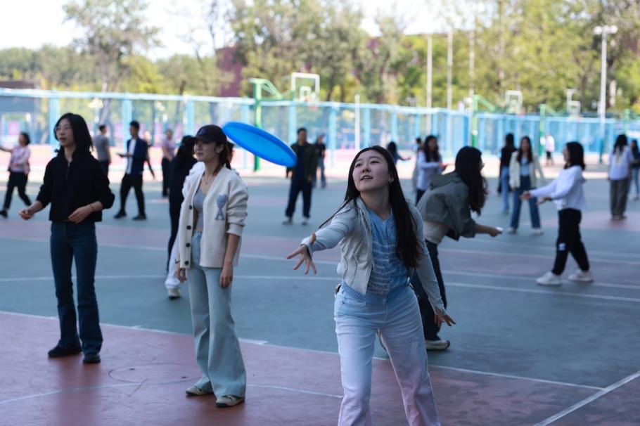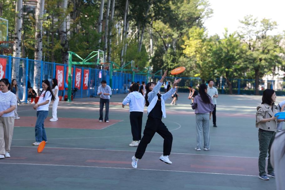 飞盘活动中,五彩飞盘在空中划出优美弧线。同学们时而快速奔跑,时而巧妙传接,战术布置与临场应变相得益彰。在一次次精彩的配合中,团队凝聚力得到升华,竞技的激情与友谊的温度交织共鸣。