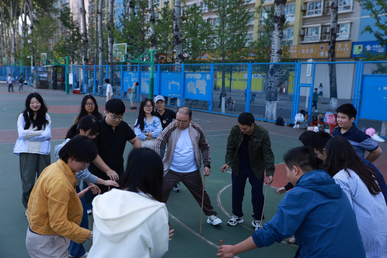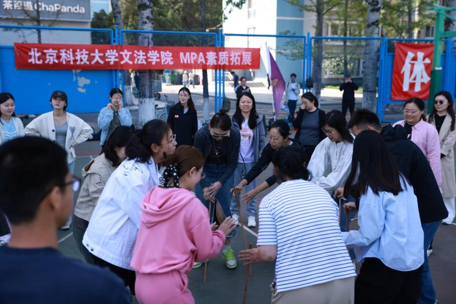 “同心同行,共创辉煌!”“文法八组,势如猛虎!”各小组响亮的口号此起彼伏,彰显着MPA学子的精神风貌。在体育皇冠博彩app 专业教练的指导下,“不倒翁”项目率先展开。同学们围成同心圆,手持木棍凝神以待。“三、二、一,移!”令声刚落,身影闪动,同学们敏捷地移动步伐,稳稳接住旁边同伴的木棍。这一刻,专注的眼神、默契的配合、会心的微笑,构成了一幅动人的画面。