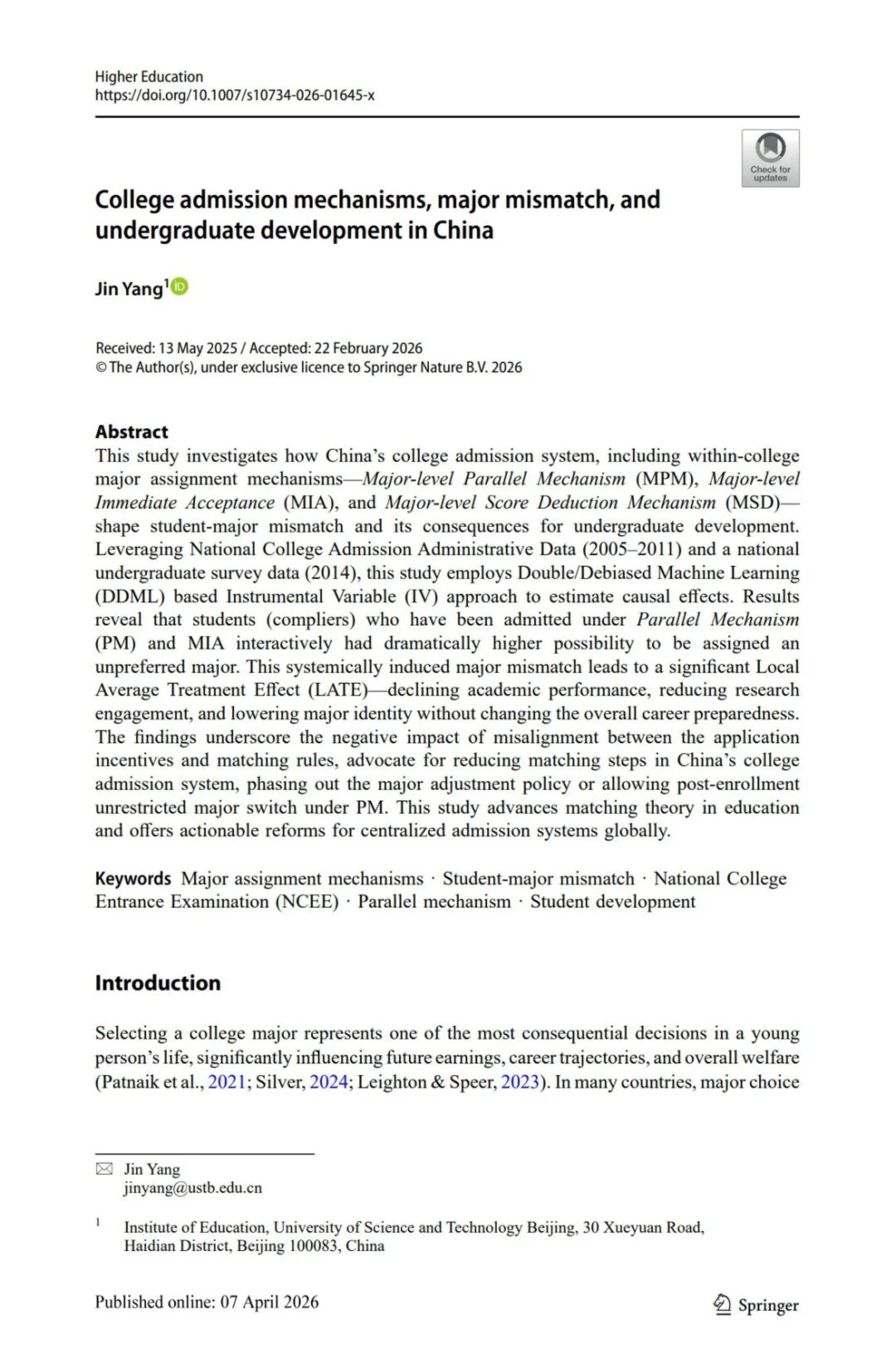参考文献:Yang, J. College admission mechanisms, major mismatch, and undergraduate development in China. Higher Education (2026).
